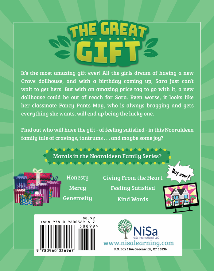 This story is an entertaining, modern Islamic morality tale for children that discusses the importance of feeling satisfied with what you have, countering greed and materialism to find peace and contentment. The Great Gift is the third story of six in the Nooraldeen Family Series involving Sara and Adam, with a variety of other multicultural characters from among friends, family and community members.